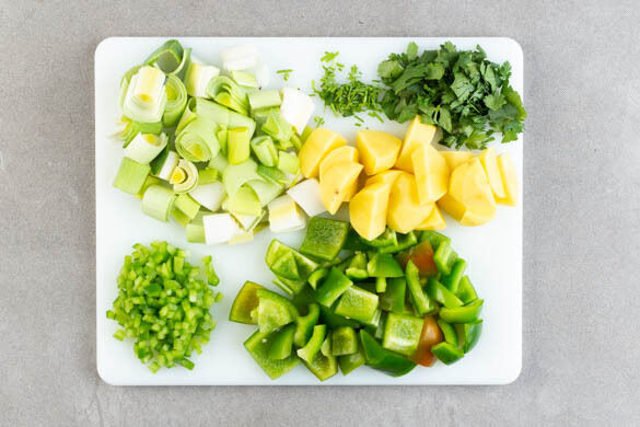 Den Lauch längs halbieren und quer in 2–3cm große Stücke schneiden. Die Paprika jeweils vierteln und entkernen, dann 6 Paprikaviertel in grobe Stücke, die übrige Paprika in kleine Würfel schneiden. Die Korianderblätter grob, die -stängel separat fein schneiden. Die ½ der Kartoffeln schälen und in 2–3cm große Stücke schneiden.