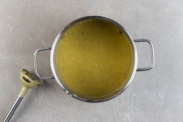 Den Lauch, die groben Paprikastücke und die geschälten Kartoffeln in einem großen Topf mit 2EL Olivenöl bei mittlerer Hitze ca. 3Min. anbraten. Die Gewürzmischung und die Korianderstängel hinzugeben und ca. 2Min. mitbraten. 800ml Wasser angießen, dann die ½ des Brühgewürzes einrühren. Das Gemüse abgedeckt in 13–15Min. weich köcheln.