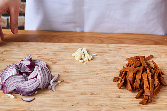 Den Koblauch schälen und fein hacken. Die Zwiebel schälen, halbieren und in feine Streifen schneiden. Die Chorizo ebenfalls in dünne Streifen schneiden.