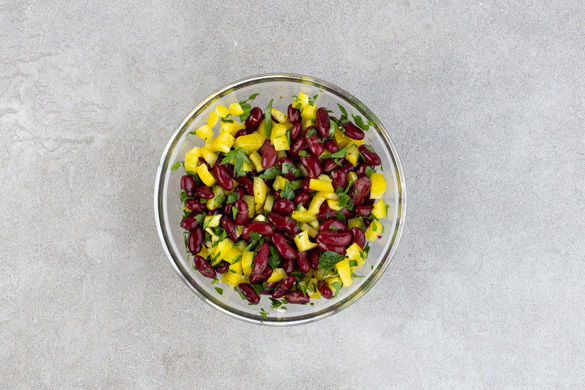 Die Bohnen in einem Sieb mit kaltem Wasser abspülen und abtropfen lassen. Die Paprika vierteln, entkernen und in kleine Würfel schneiden. Die Petersilie bis auf 1EL mit 1EL Olivenöl, 1–2EL Essig sowie je 1 Prise Salz und Pfeffer zu einem Dressing verrühren. Die Bohnen und die Paprika mit dem Dressing vermengen und bis zum Servieren ziehen lassen.