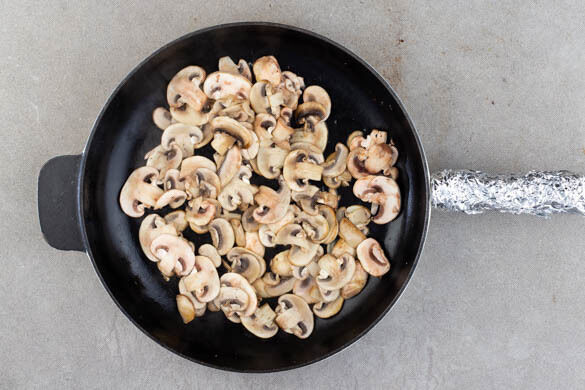 Die Pilze in einer großen, ofenfesten Pfanne ohne Zugabe von Fett bei starker Hitze ca. 5Min. anbraten, dabei nicht zu häufig rühren. Inzwischen den Käse fein reiben.