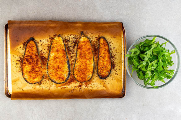 Die Auberginen längs in fingerdicke Scheiben schneiden, auf ein mit Backpapier ausgelegtes Backblech legen, von allen Seiten mit 4EL Olivenöl einreiben und mit ½TL Salz würzen. Die Auberginen auf der oberen Schiene des Ofens ca. 10Min. pro Seite goldbraun grillen. Tipp: Dabei ca. 10cm Abstand zwischen dem Grill und den Auberginen lassen.