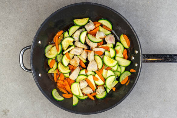 Die Karotten mit 2EL Pflanzenöl in einer mittelgroßen Pfanne bei mittlerer Hitze in 3–5Min. bissfest anbraten. Die Zucchini und das Fleisch in die Pfanne geben und 3–5Min. mitbraten, bis das Fleisch leicht gebräunt ist. Mit je 1 kräftigen Prise Salz und Pfeffer würzen.