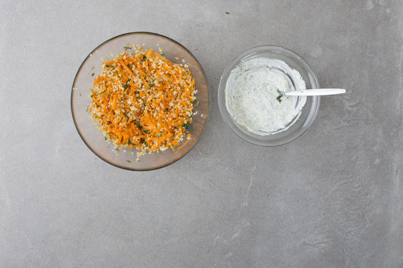 Die Karotten ggf. schälen, mit einer Küchenreibe grob raspeln und mit 3EL Essig, ½–1TL Zucker und 1 Prise Salz vermengen und beiseitestellen.