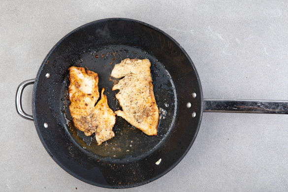 Die Schnitzel in der Pfanne mit 2EL Olivenöl bei mittlerer Hitze auf jeder Seite 3–4Min. goldbraun braten, bis das Fleisch durch ist.
