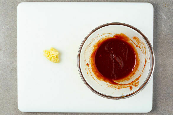 Den Backofen auf 210°C (190°C Umluft) vorheizen. Den Knoblauch schälen und sehr fein würfeln oder durch eine Knoblauchpresse drücken. Das Tomatenmark mit 6EL Wasser und 2EL Balsamicoessig verrühren und mit je ½TL Salz und Pfeffer würzen.