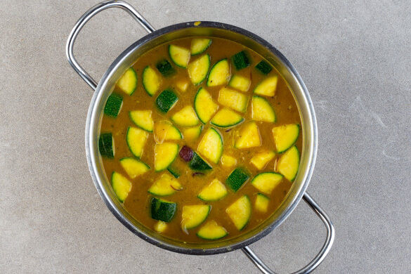 Die Zwiebeln und die Zucchini in einem großen Topf mit 2EL Pflanzenöl bei mittlerer bis starker Hitze 1–2Min. scharf anbraten. Den Knoblauch, das Brühgewürz und ca. 4TL Currypulver unterrühren, dann mit den Kichererbsen samt Flüssigkeit ablöschen. Das Curry 4–5Min. sanft köcheln lassen, bei Bedarf noch etwas Wasser hinzugeben.