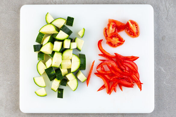 Die Zucchini längs vierteln und quer in ca. 1cm breite Stücke schneiden. Die Tomaten vierteln, das Kerngehäuse entfernen und in ein hohes Püriergefäß geben, dann die Tomaten in dünne Streifen schneiden.