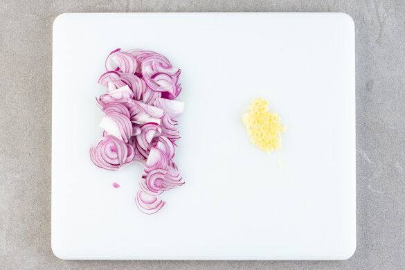 Die Zwiebeln schälen, halbieren und in feine Streifen schneiden. Den Knoblauch schälen und fein reiben oder sehr fein würfeln.