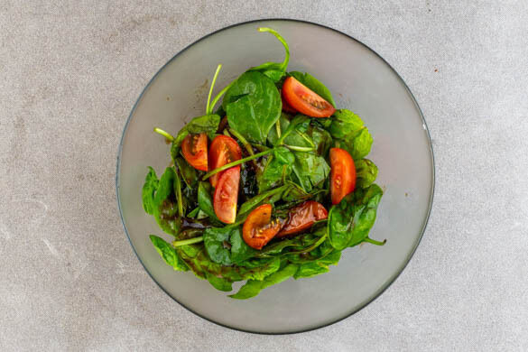 Die ½ der Hoisinsauce mit ½EL veganer Mayonnaise und 1EL Essig zu einem Dressing verrühren. 1 Handvoll Spinat beiseitelegen, den restlichen Spinat und die Tomaten mit dem Dressing vermengen und mit Salz und Pfeffer abschmecken.