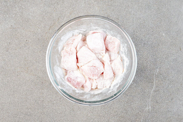 Das Fleisch trocken tupfen und mit 1EL Mehl vermengen.