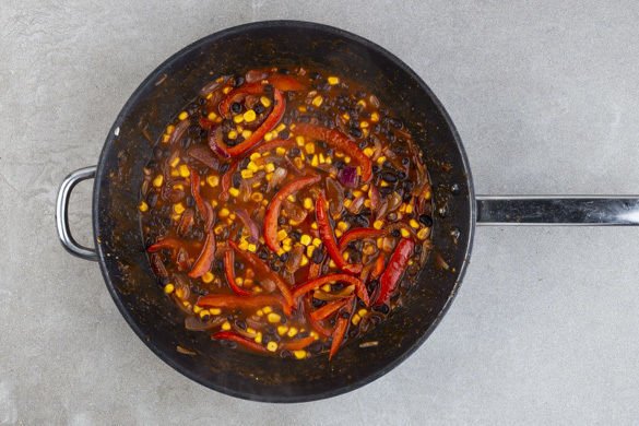 Die Bohnen und den Mais in einem Sieb abtropfen lassen und mit den passierten Tomaten zum Gemüse in die Pfanne geben. Mit Salz und Pfeffer würzen, das Gemüse zum Kochen bringen und ca. 5Min. bei mittlerer Hitze köcheln lassen. Mit der restlichen Gewürzmischung nach Geschmack sowie Salz und Pfeffer würzen.