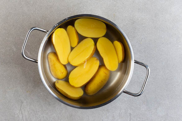 In einem mittelgroßen Topf ausreichend gesalzenes Wasser für die Kartoffeln zum Kochen bringen. Die Kartoffeln samt Schale der Länge nach halbieren. Die Kartoffeln in das kochende Wasser geben und in 12–15Min. gar köcheln. Anschließend abgießen und mit kaltem Wasser abschrecken. In einem Sieb abtropfen lassen.