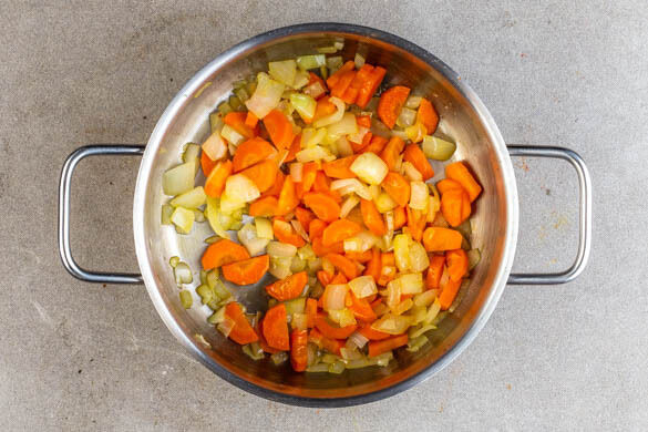 Die Karotten in einem mittelgroßen Topf mit 1EL Pflanzenöl bei mittlerer Hitze ca. 6Min. anbraten, dann die Zwiebeln hinzugeben und 3–4Min. weiterbraten, bis die Karotten weich und die Zwiebeln glasig sind.