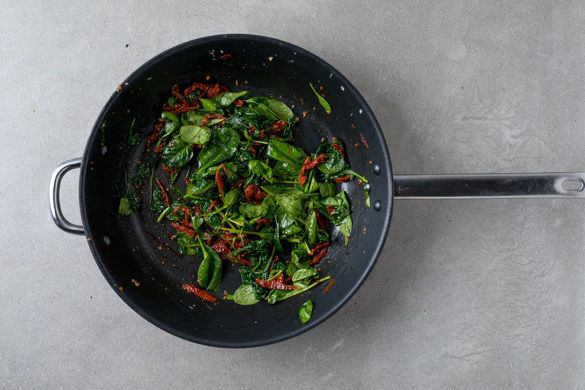 Den Knoblauch in der Pfanne mit 1EL Olivenöl bei mittlerer Hitze ca. 30Sek. anrösten. Die getrockneten Tomaten dazugeben und 1–2Min. mitbraten, bis der Knoblauch weich ist. Dann auch den Spinat portionsweise in die Pfanne geben und unter Rühren zusammenfallen lassen. Mit Salz und Pfeffer würzen.