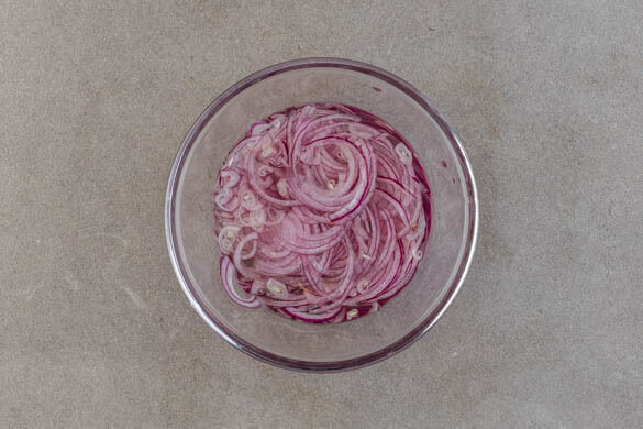 Die Zwiebel schälen, halbieren, in dünne Streifen schneiden und in kaltem Wasser einweichen. Vor dem Weiterverarbeiten in einem Sieb abtropfen lassen. Tipp: Wer ein kräftigeres Zwiebelaroma bevorzugt, lässt das Einweichen einfach weg.