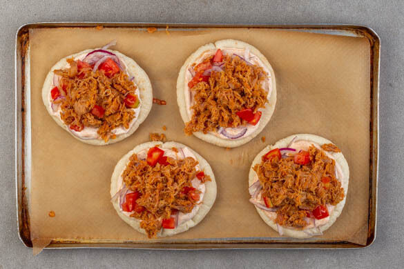 Die Pitabrote auf einem mit Backpapier ausgelegten Backblech verteilen, ggf. ein zweites Blech verwenden. Die Pitas mit der Crème fraîche bestreichen und mit der ½ der Zwiebeln, den Tomaten und dem Pulled Chicken belegen.
