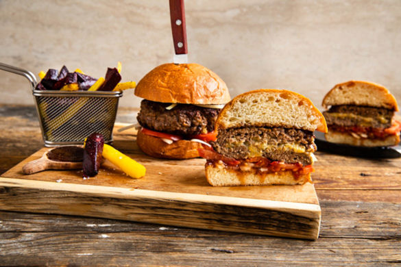 Welch köstliche Überraschung, wenn du in diesen herzhaften Burger beißt und entdeckst, dass sich im saftigen Rinderhackfleisch eine aromatische Füllung mit schmelzendem Käse verbirgt! Frische Tomatenscheiben und Zwiebeln sowie eine würzige BBQ-Honig-Sauce passen perfekt dazu. Nicht weniger köstlich: die bunten Gemüsepommes aus Rote Bete und Karotten. Guten Appetit!