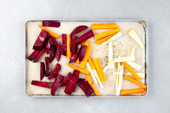 Die Karotten und die Rote Bete schälen und in 0,5–1cm dünne, pommesartige Stifte schneiden. Das Gemüse auf einem mit Backpapier belegten Backblech verteilen und mit 1–2EL Olivenöl sowie Salz und Pfeffer vermengen. Gleichmäßig verteilen und ca. 15Min. im Ofen backen. Die Tomate in dünne Scheiben schneiden, dabei den Strunk entfernen.