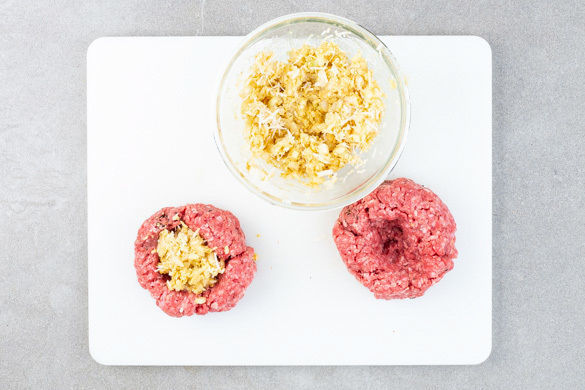 Die Zwiebelwürfel und den Knoblauch mit dem Senf verrühren. Den Käse fein reiben und untermengen. Das Hackfleisch mit Salz und Pfeffer verkneten und zu 2 gleich großen Kugeln formen. Mit dem Finger eine Mulde in das Hackfleisch drücken, die Füllung gleichmäßig auf die Mulden verteilen und festdrücken. Das Hackfleisch über der Füllung gut verschließen.