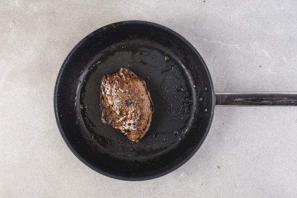 Das Fleisch mit etwas Küchenkrepp trocken tupfen und mit Salz und Pfeffer würzen. In einer mittelgroßen Pfanne mit 1–2EL Olivenöl bei starker Hitze auf beiden Seiten ca. 1Min. scharf anbraten, dann in eine Auflaufform geben und im Ofen 5–7Min. nachgaren, bis das Fleisch in der Mitte noch leicht rosa ist. Die Pfanne aufbewahren.