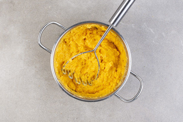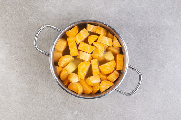 Den Backofen auf 160°C Umluft (180°C Ober-/Unterhitze) vorheizen. Die Süßkartoffel und die 1/2 der Kartoffeln schälen und in ca. 2cm große Stücke schneiden. Die restlichen Kartoffeln werden für dieses Rezept nicht benötigt. In einem mittelgroßen Topf mit ausreichend gesalzenem Wasser bedecken, zum Kochen bringen und in 10–15Min. weich kochen.