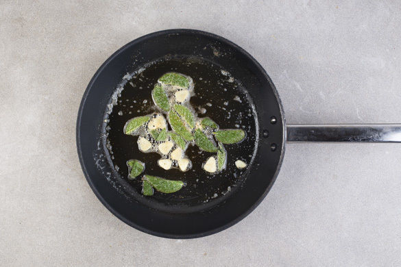 Ca. 2EL Butter in der Pfanne bei mittlerer Hitze erwärmen und schmelzen lassen, bis die Butter leicht braun wird. Die Hälfte der geschmolzenen Butter aus der Pfanne nehmen und aufbewahren. Den Salbei und den Knoblauch in die Pfanne geben und ca. 30Sek. braten.