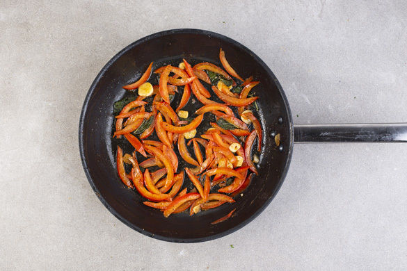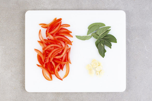Die Tomaten vierteln, entkernen und in dünne Streifen schneiden. Die Salbeiblätter von den Stängeln zupfen und längs halbieren. Den Knoblauch schälen und in feine Scheibchen schneiden.