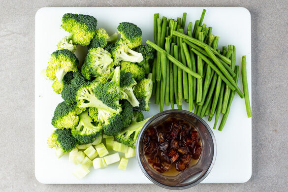 In einem großen Topf ausreichend gesalzenes Wasser für den Brokkoli und die grünen Bohnen zum Kochen bringen. Den Brokkoli in mundgerechte Röschen schneiden. Den Strunk ggf. schälen und in 2–3cm große Würfel schneiden, dabei die unteren 1–2cm entfernen. Die Enden der grünen Bohnen entfernen. Die Datteln mit 100ml Wasser in ein hohes Gefäß geben und einweichen lassen.