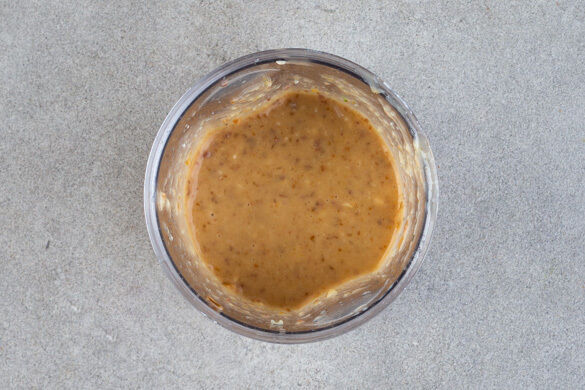 Die restlichen Sardellenfilets samt Öl, den Knoblauch, 2EL Zitronensaft und 1 Prise Pfeffer zu den Datteln in das hohe Gefäß geben und alles zu einem cremigen Dressing pürieren. Mit Salz abschmecken.
