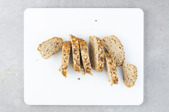 Die Mehrkornstange während der letzten 6–8Min. der Garzeit zum Auflauf in den Ofen geben und knusprig aufbacken. Anschließend in Scheiben schneiden und mit der Gremolata und den Zitronenspalten zum Bohnen-Speck-Auflauf servieren.