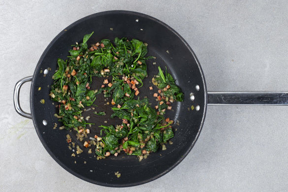 Die Hitze reduzieren und die Zwiebeln sowie die 1/2 des Knoblauchs zum Speck in die Pfanne geben und 2–3Min. mitbraten. Anschließend nach und nach den Spinat hinzufügen und zusammenfallen lassen.
