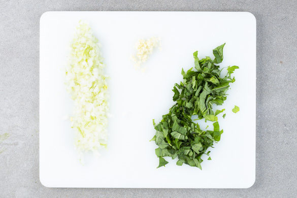 Den Backofen auf 200°C Umluft (220°C Ober-/Unterhitze) vorheizen. Die Zwiebel schälen, halbieren und in feine Würfel schneiden. Den Knoblauch schälen und ebenfalls fein würfeln. Die Basilikumblätter abzupfen und grob schneiden.