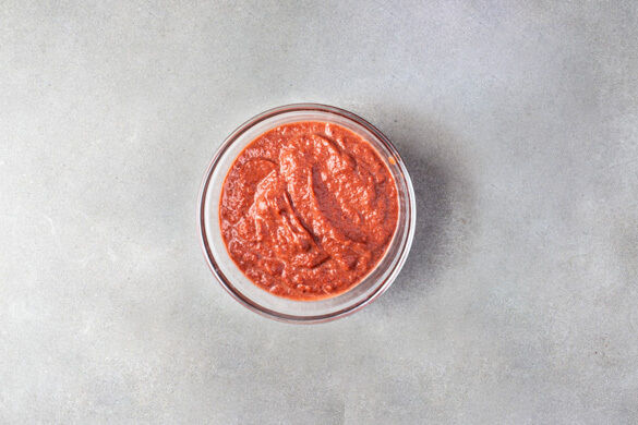 Die Rote Bete in ein Sieb abgießen, dabei die Flüssigkeit auffangen. Die Rote Bete grob würfeln und mit der Flüssigkeit, 1TL Olivenöl und 1TL Essig in einem hohen Gefäß mit einem Stabmixer glatt pürieren, ggf. 1–2EL Wasser zufügen. Das Püree mit Salz und Pfeffer abschmecken. Tipp: Da Rote Bete stark färbt, beim Verarbeiten am besten Küchenhandschuhe und Schürze tragen.