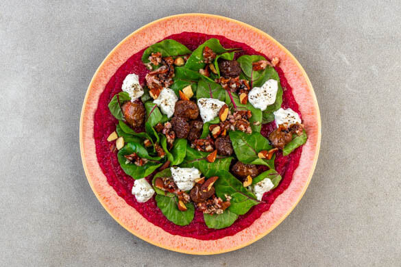 Bitte nicht drängeln, es ist an alle gedacht! Hinter diesem Masterplan von einem Rezept steht unsere Köchin Tamara. Sie verwöhnt deinen Gaumen heute mit würziger Bio-Rindswurst, die auf einem Mangoldbett mit Balsamicocreme und leuchtendem Rote-Bete-Püree ruht. Unwiderstehlich! Aber das können wir noch toppen und zwar mit dem cremigsten Burratakäse und herrlich rauchigen Mandeln. Für diese Leckerei würde jeder Schlange stehen!