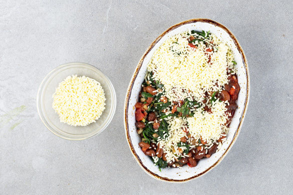 Die Bohnen in einem Sieb abtropfen lassen. In einer Auflaufform mit den gehackten Tomaten und dem Basilikum mischen und mit Salz und Pfeffer würzen, dann die Spinat-Speck-Pfanne auf dem Bohnengemüse verteilen. Den Käse auf der Oberfläche verteilen und den Auflauf 15–20Min. im Ofen backen, bis der Käse goldbraun zerlaufen ist.