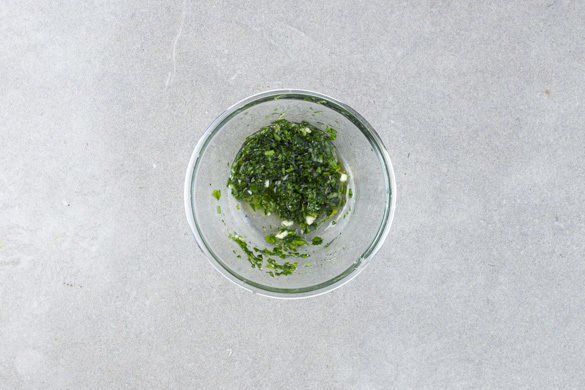 Währenddessen die Petersilie samt Stängeln fein hacken. Die Zitronenschale abreiben, dann die Zitrone in Spalten schneiden. Die Petersilie und den restlichen Knoblauch mit 2–3EL Olivenöl, 2–3TL Zitronensaft sowie 2TL Zitronenabrieb verrühren und die Gremolata mit Salz und Pfeffer abschmecken.