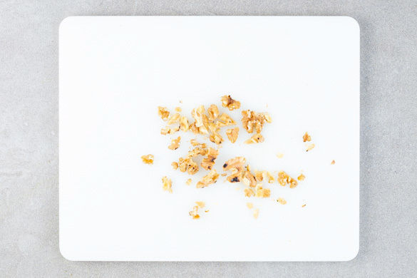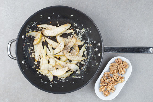 Die Walnüsse in einer großen Pfanne ohne Zugabe von Fett bei mittlerer Hitze 3–5Min. anrösten. Aus der Pfanne nehmen und beiseitestellen. Dann die Birnenscheiben und die Schalottenwürfel in der Pfanne mit 1EL Olivenöl bei mittlerer Hitze ca. 4Min. braten. Mit Salz und Pfeffer kräftig würzen.