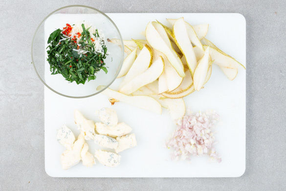 Den Hartkäse fein reiben. Die Rosmarinnadeln und die Petersilie fein hacken und mit dem Hartkäse und der gehackten Peperoni vermengen. Die Birnen vierteln, vom Kerngehäuse befreien und in ca. 0,5cm breite Scheiben schneiden. Die Schalotten schälen und fein würfeln. Den Blauschimmelkäse in grobe Stücke schneiden.