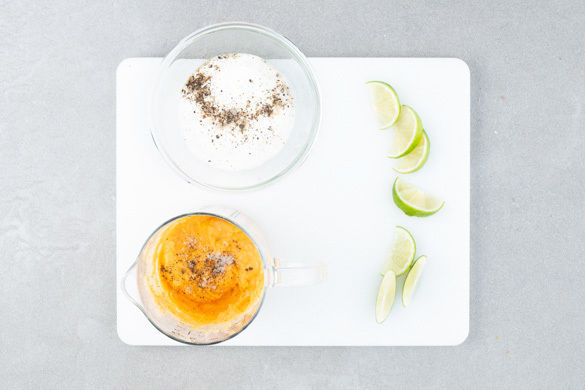 Eine Limettenhälfte auspressen, die andere Hälfte in Spalten schneiden. Den Knoblauch schälen und grob würfeln. Die restlichen Süßkartoffeln in einem hohen Gefäß mit dem Limettensaft, 2–3EL Wasser, dem Knoblauch, der Tahinipaste und der 1/2 der Chiliflocken pürieren und mit Salz und Pfeffer abschmecken. Die saure Sahne mit Salz und Pfeffer würzen.