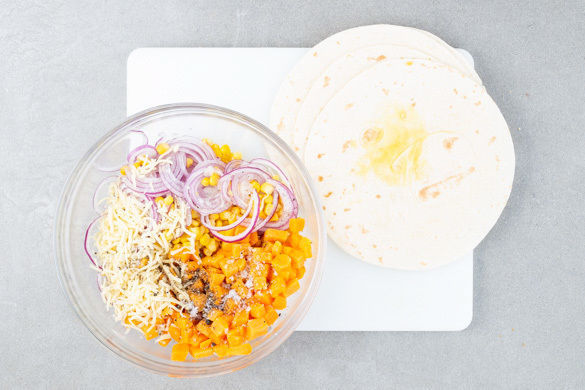 Den Mais abgießen. Die Zwiebeln halbieren, schälen und in dünne Streifen schneiden. Ca. 3/4 der Süßkartoffeln mit dem Mais, den Zwiebeln und dem Käse vermengen und mit Salz und Pfeffer würzen. Die Tortillas mit insgesamt 1–2TL Olivenöl bestreichen.
