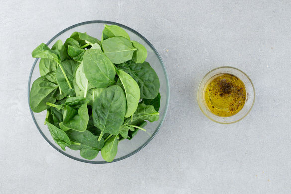 Aus 2–3EL Olivenöl, 2EL Essig, 1–2EL Wasser sowie Salz, Pfeffer und Zucker ein Dressing anrühren und mit dem Spinat vermengen.