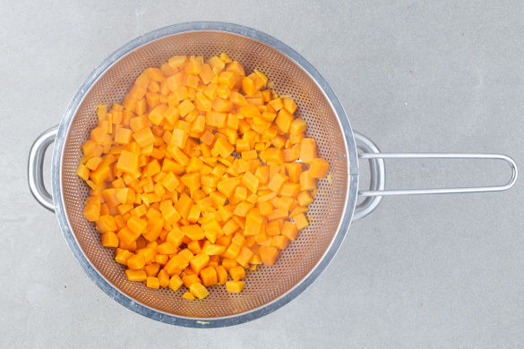 Den Backofen auf 200°C Umluft (220°C Ober-/Unterhitze) vorheizen. In einem mittelgroßen Topf 800ml gesalzenes Wasser zum Kochen bringen. Die Süßkartoffel schälen und in 0,5–1cm große Würfel schneiden. In das kochende Wasser geben und in 5–8Min. weich kochen, dann in ein Sieb abgießen und abtropfen lassen.