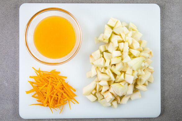 Die Birnen schälen, vierteln, entkernen und in mundgerechte Stücke schneiden. Die Orangenschale abreiben, dann die Orange halbieren und auspressen.