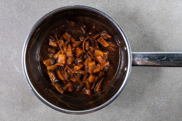 Die Birnen, die Orangenschale, den Orangensaft, 150g Zucker, dsenZimt und 150ml Wasser in einem kleinen Topf vermengen, bis sich der Zucker auflöst. Bei starker Hitze aufkochen und anschließend bei mittlerer Hitze 10–15Min. einköcheln lassen, bis das Kompott eine karamellartige Konsistenz hat. Gelegentlich umrühren.