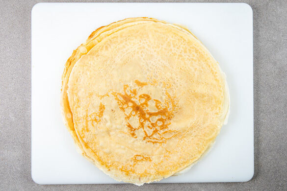 In einer großen Pfanne ½TL Pflanzenöl oder Butter bei mittlerer Hitze erwärmen. Die Pfanne vom Herd nehmen und ca. 100ml Teig für 1 Crêpe hineingeben, dabei die Pfanne leicht schwenken, um den Teig gleichmäßig rund auf dem Pfannenboden zu verteilen. Die Crêpe 1–2Min. ausbacken, dann wenden und weitere ca. 30Sek. backen. Den Vorgang wiederholen, bis der Teig aufgebraucht ist.