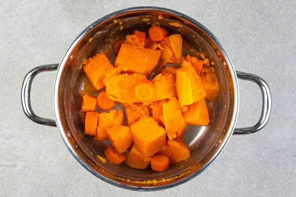 Die Süßkartoffel schälen und grob würfeln. Die Karotten ggf. schälen und in ca. 2cm große Stücke schneiden. Die Süßkartoffeln und die Karotten in einem großen Topf mit ausreichend gesalzenem Wasser aufkochen und bei niedriger bis mittlerer Hitze 10–12Min. köcheln, bis das Gemüse gar ist. Dann in ein Sieb abgießen, zurück in den Topf geben und abgedeckt warm halten.
