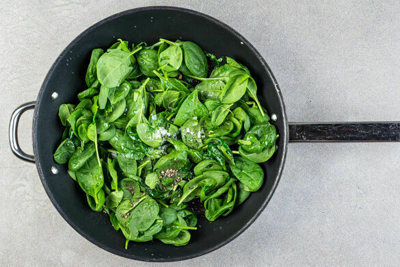 Den Spinat zum Knoblauch in die Pfanne geben, 2EL hellen Essig hinzufügen und 1–2Min. köcheln lassen, bis der Spinat zusammenfällt und die Flüssigkeit verdampft ist. Mit Salz und Pfeffer abschmecken.