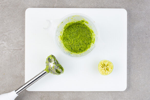 Das Gemüse aus der Pfanne in ein hohes Gefäß geben und mit ca. ¾ des Korianders mit einem Stabmixer pürieren. 1 Limette halbieren, auspressen und den Saft in die Salsa rühren. Die Salsa mit Salz und Pfeffer abschmecken.