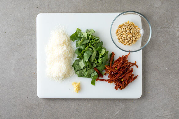 Den Käse fein reiben. Die Basilikumblätter abzupfen und grob schneiden. Die getrockneten Tomaten in dünne Streifen schneiden. Den Knoblauch schälen und fein würfeln. Die Pinienkerne in einer großen Pfanne ohne Zugabe von Fett mittlerer Hitze 2–3Min. goldbraun anrösten. Vorsicht, sie können schnell verbrennen. Zum Abkühlen aus der Pfanne nehmen. Die Pfanne aufbewahren.